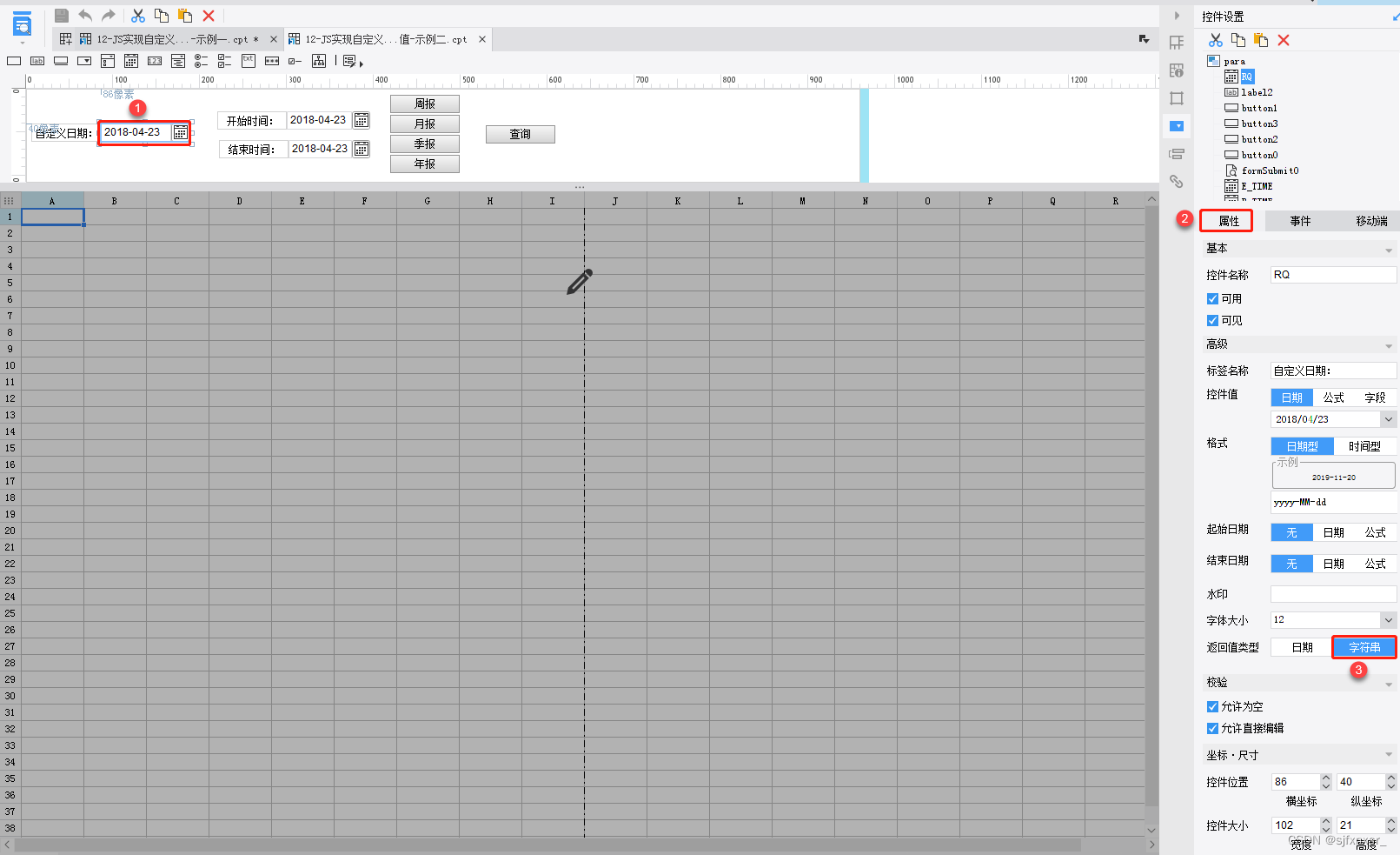 2)将日期控件 RQ 的返回类型设置成:字符串,格式设为:yyyy-MM-dd。如下图所示:
