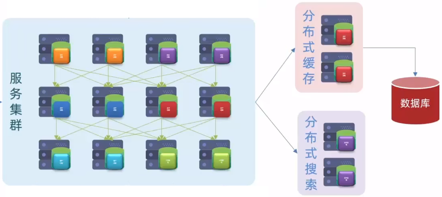 分布式缓存:随着服务集群规模的扩大,数据库无法承载高并发,因此加入缓存(分布式缓存),将数据库数据放入内存。请求到了,先去缓存,缓存未命中再去数据库。
