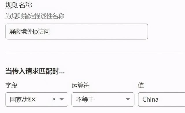 创建一条防火墙规则,规则屏蔽境外IP访问,选择国家/地区,不等于,china,最后选择阻止,如下图: