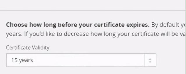 这时会提示你创建证书,我们按着步骤操作,在下面这个年数的时候,我们选择15年,如下图: