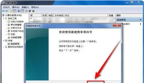 7.在“新建简单卷向导”窗口中,点击“下一步”按钮。