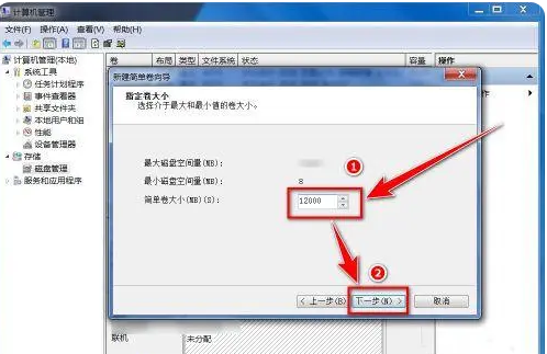 8.在“简单卷大小”的窗口中输入分区磁盘容量大小,再点击“下一步”。