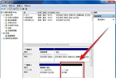5.在“磁盘管理”的界面中,可以看到有个磁盘上写着“未分配”,这便是新添加的固态硬盘,右键点击此硬盘。