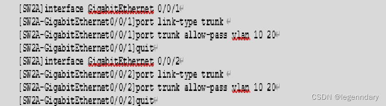 3.配置交换机端口为Trunk,并允许VLAN10和VLAN20通过。