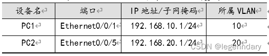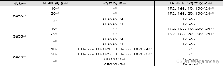 (2)在SW3A、SW3B和SW2A上划分VLAN10和VLAN20,端口范围、端口模式和IP地址分配,如表