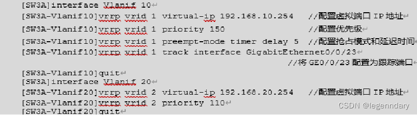 (1)配置三层交换机SW3A的VRRP功能,配置交换机上每个VLAN的虚拟端口IP地址、优先级、抢占模式和延迟时间。