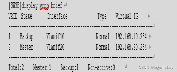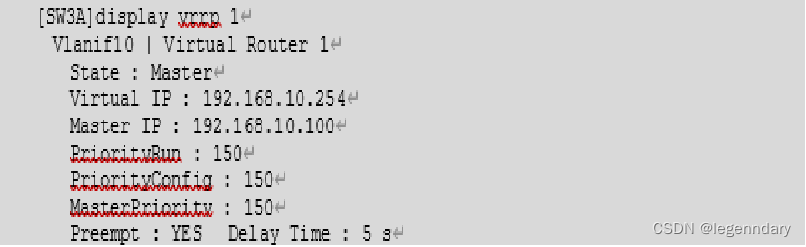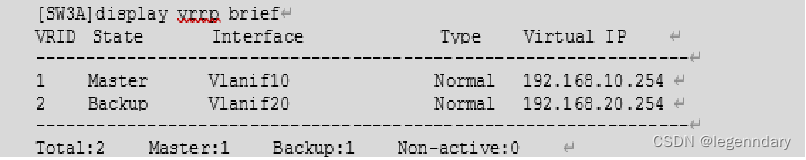 (2)在交换机SW3A上使用display vrrp 1命令,查看当前工作状况。