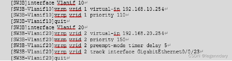 (2)配置三层交换机SW3B的VRRP功能,配置交换机上每个VLAN的虚拟端口IP地址、优先级、抢占模式和延迟时间。