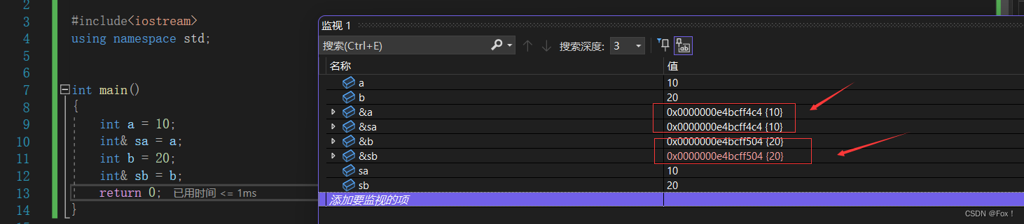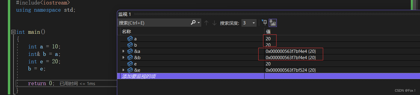 显然不是的,这里只是将e的值赋给了b,b还是a的引用,程序结束后a和b都应该为20,我们可以打开监视窗口看看: