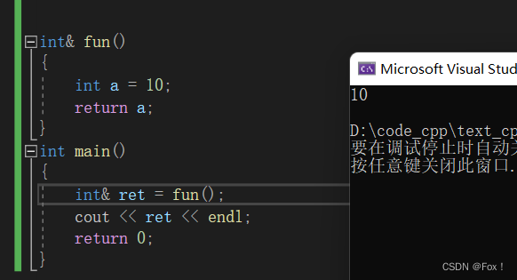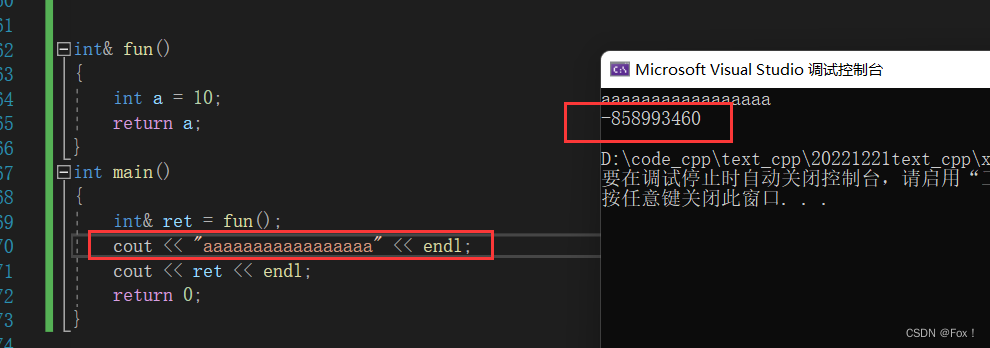 我们知道a是一个局部变量,出了作用域就要被销毁,再销毁前我们将a的引用用了一个临时引用变量来保存(假设这个临时变量为tmp(类型是int&)),我们发现tmp和ret都是变量a的别名,而a出了作用域就被释放了,没有加cout输出一堆字符时我们发现结果正确只是因为释放过了空间后a还没有被改变,当为cout重新建立栈帧的时候a已经被修改了,这种返回局部变量的引用是一件极其危险的事情。