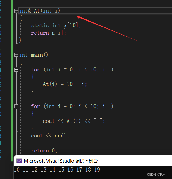 {for (int i = 0; i < 10; i++){At(i) = 10 + i;}for (int i = 0; i < 10; i++){cout << At(i) << " ";}cout << endl;return 0;