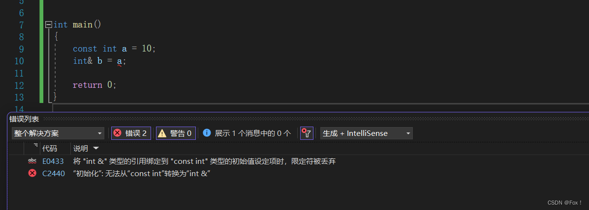 {const int a = 10;int& b = a;return 0;