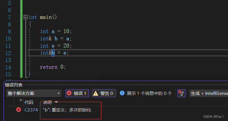 {int a = 10;int& b = a;int e = 20;b = e;return 0;