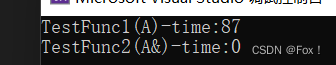 {// 以值作为函数的返回值类型size_t begin1 = clock();for (size_t i = 0; i < 100000; ++i)TestFunc1();size_t end1 = clock();// 以引用作为函数的返回值类型size_t begin2 = clock();for (size_t i = 0; i < 100000; ++i)TestFunc2();size_t end2 = clock();// 计算两个函数运算完成之后的时间cout << "TestFunc1 time:" << end1 - begin1 << endl;cout << "TestFunc2 time:" << end2 - begin2 << endl;