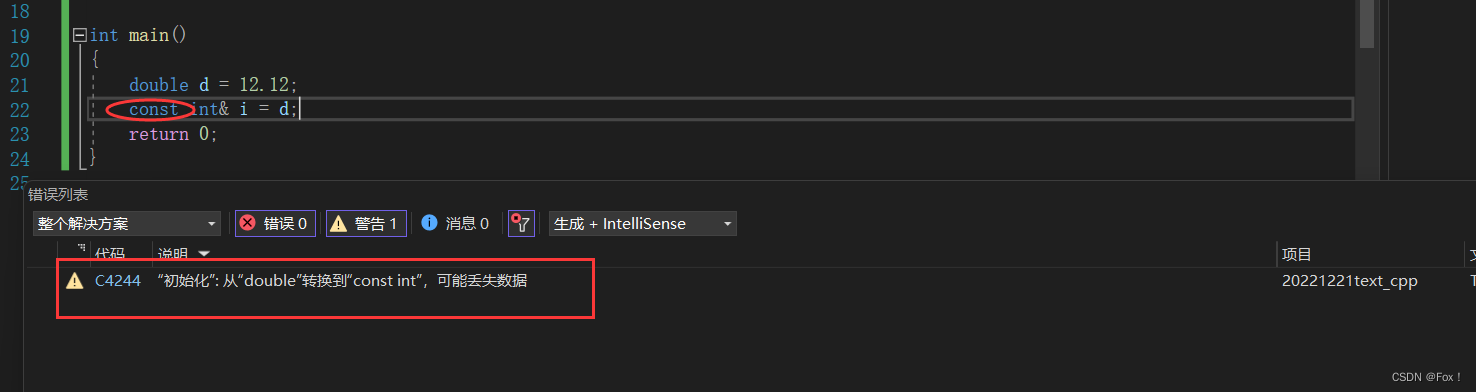 通过C语言的知识我们知道:double类型的d如果要转换成int类型的i是会发生截断的,首先会用一个临时变量来保存被截断后的值,再将该值换一个新的名称,d本身是不会发生任何改变的。而这个临时变量是具有常数性的(这个很重要,后面也会反复的提及)不能被修改,也就是不能够写,只能够读。由于权限不能够升高,所以我们必须得加const才行。