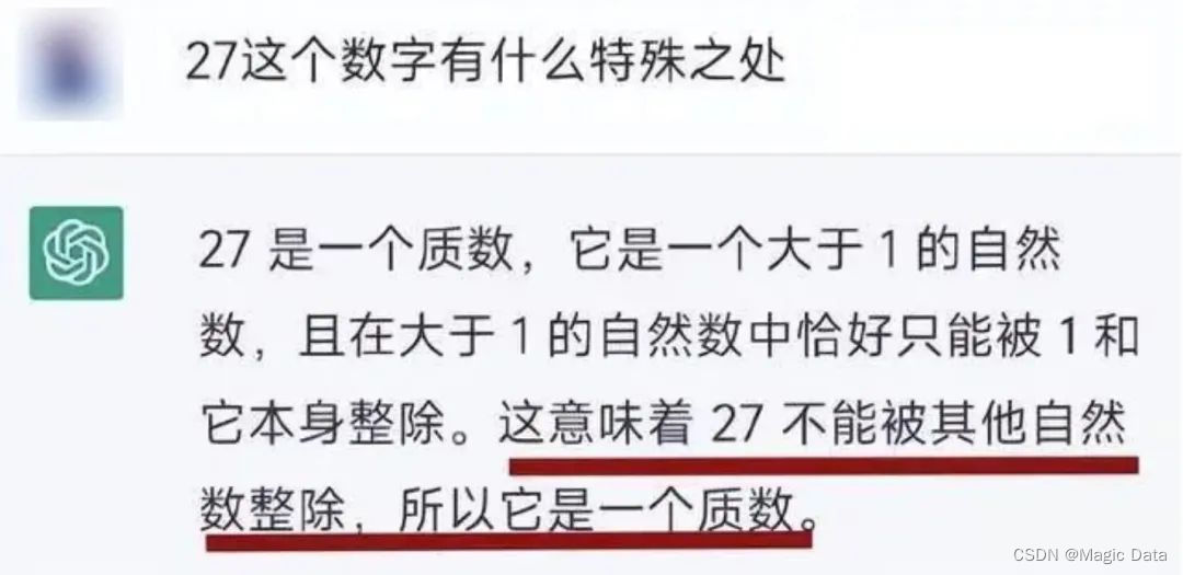 尽管ChatGPT对大部分问答回复的都非常完美,但是,ChatGPT本质上和传统的聊天机器人并没有分别——它并不理解自己所说的话,有时回答内容还是会犯一些低级错误。一段“网友调教这只AI”的聊天记录,让人不禁质疑AI是否真的鄙人聪明,对于27是质数与否为题回答有误,也表明了人工智能“智障”的一面。