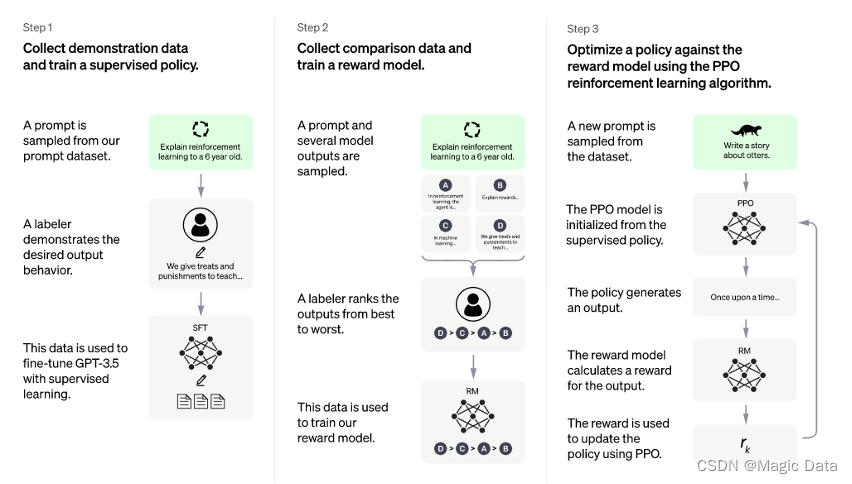 与所有大数据模型一样,ChatGPT同样也是经过“预训练+微调”的过程,但是OpenAI这次在数据收集上设置上有了细微的差别。结合人类反馈信息来训练语言模型使其能理解指令,也就是模型训练中加入了人类的评价和反馈数据,而不仅仅是事先准备好的数据集。通过公测形式可以积累大量用户反馈数据继续优化ChatGPT的性能。引入“人工标注数据+强化学习“来不断Fine-tune预训练语言模型,主要目的是让LLM模型学会理解人类的命令指令的含义,其训练步骤分为三部:
