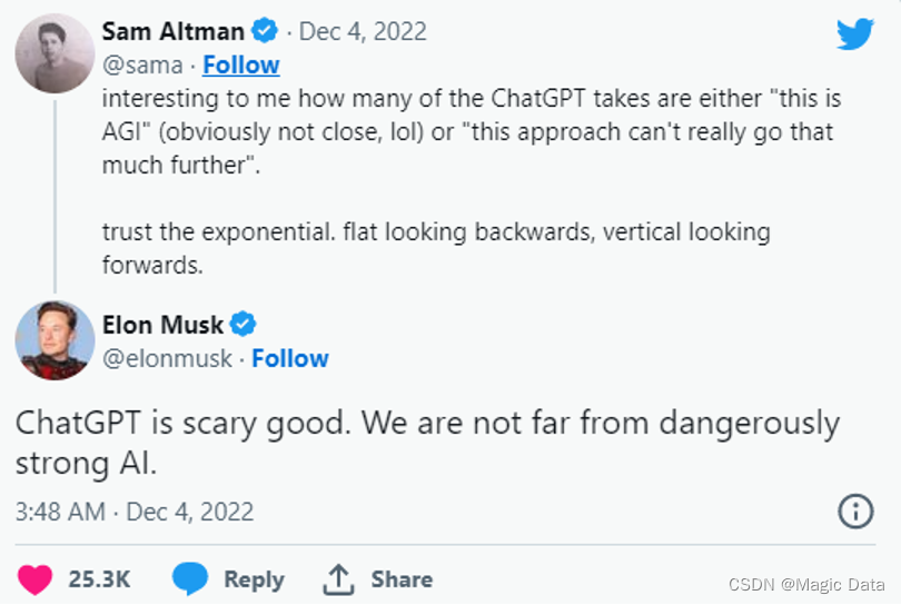 在过去的一月里,人工智能领域中最火的话题莫过"ChatGPT"。ChatGPT是OpenAI于11月30日发布最新作品聊天机器人,开放公众免费测试。聊天机器人是一种软件应用程序,根据用户的提问做出回应、模仿人类的对话方式。目前,ChatGPT的用户量已经超过一百万。它既能完成包括写代码,修bug(代码改错),翻译文献,写小说,写商业文案,创作菜谱,做作业,评价作业等一系列常见文字输出型任务,而且在和用户对话时,能记住对话的上下文,反应非常逼真。连马斯克都在推特上称赞道,“ChatGPT真是惊人的好。我们离危险的强大人工智能不远了”: