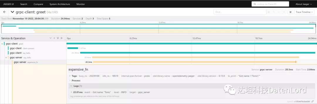 但 tracing 输出的内容多出了 Span 相关的信息。由 instrument 生成的 Span 还自动添加了函数的参数信息。下面介绍的 OpenTelemetry 和 Jaeger,还可以让我们更加直观的查看 Span 之间的时间关系。