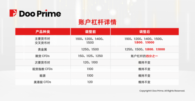 2022 年 11 月 19 日,Doo Prime 正式将全部账户类型的可选杠杆从 1:500 上调至 1:1000 倍,提供更灵活的杠杆选择,让全球客户有机会以更少的资金撬动更高的潜在利润,进一步拓展投资机遇。