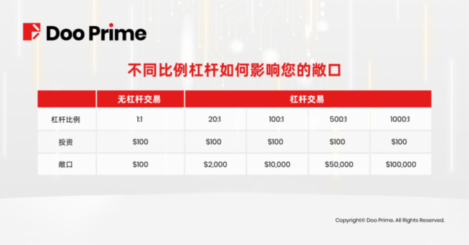 现在,Doo Prime 提供高达 1000 倍杠杆,您可以灵活选择杠杆倍数,投入相应的保证金开设完整仓位,撬动比无杠杆交易更加丰厚的潜在利润。