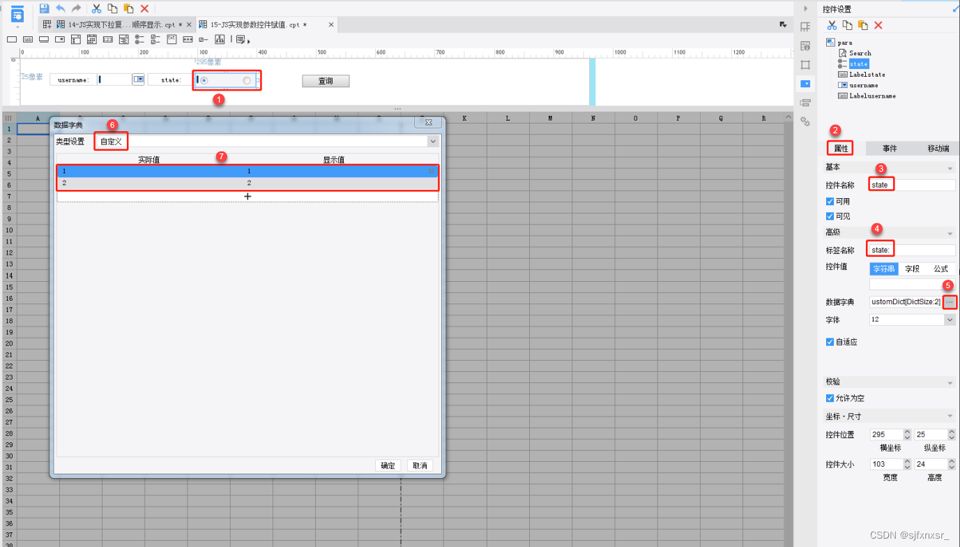 6)选择单选按钮组控件 state,设置数据字典,类型设置选择自定义,实际值和显示值都为:1,2 。如下图所示: