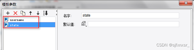 1)新建模板,点击「菜单模板-模板参数」,添加两个模板参数:username 和 state,如下图所示: