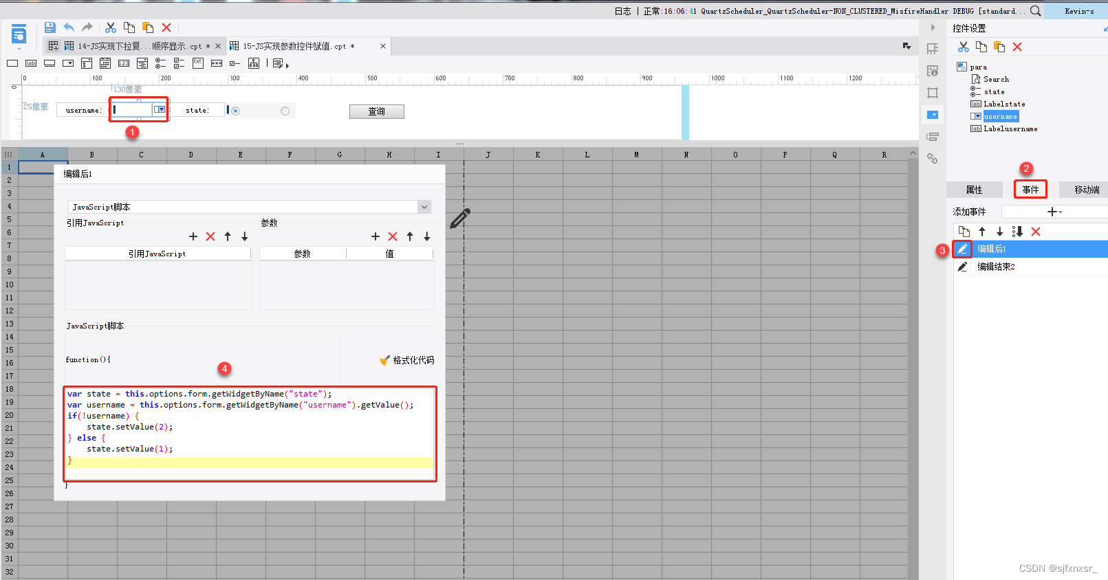 参数界面中,往往需要在一个控件中动态的控制其他控件的值,如下图,当 username 有值时,state 自动变为 1,当 username 无值时,state 自动变为 2。