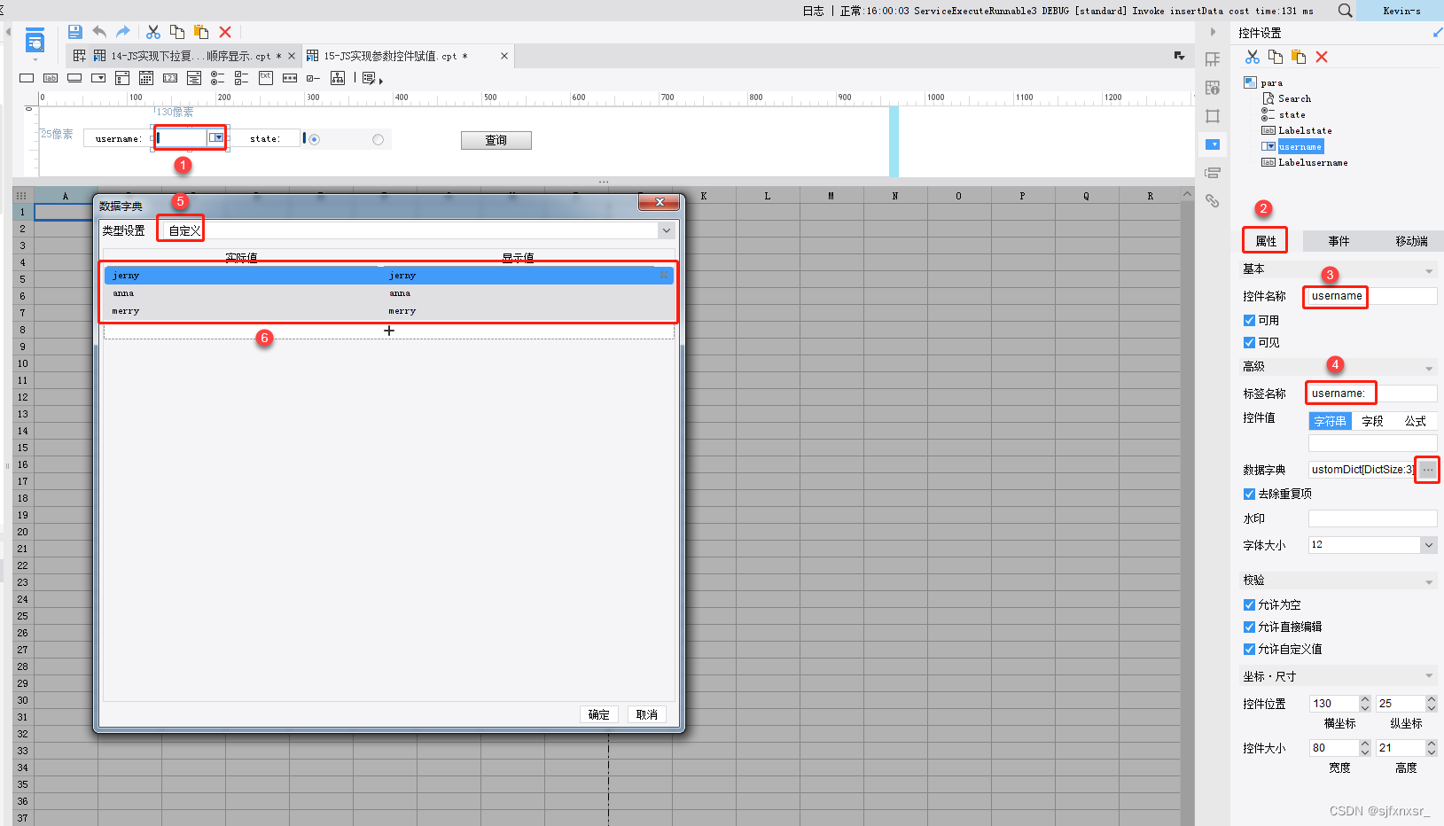 5)选择下拉框控件 username,设置数据字典,类型设置选择自定义,实际值和显示值都为:jerny,anna,merry,如下图所示: