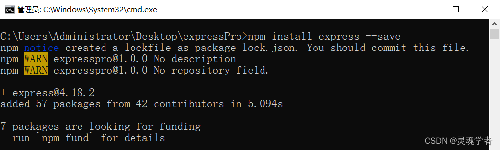 先创建项目文件夹并命名未expressPro,通过CMD命令进入到项目文件目录下,当然使用Git-Bash 、Power shell 或者在编译器当中均可操作;