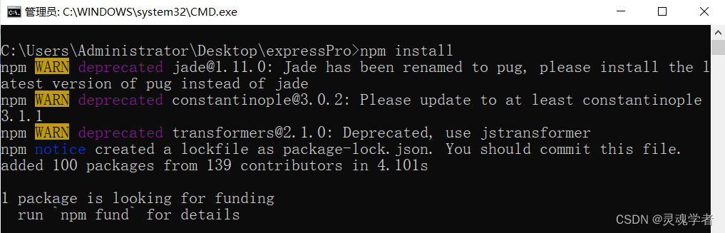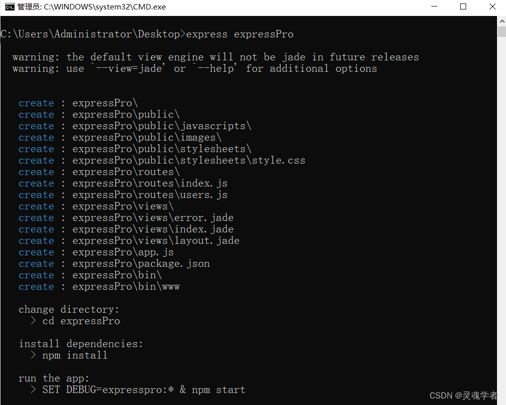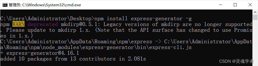 打开CMD,输入命令;在Express 4.x版本中,express-generator需要单独安装;