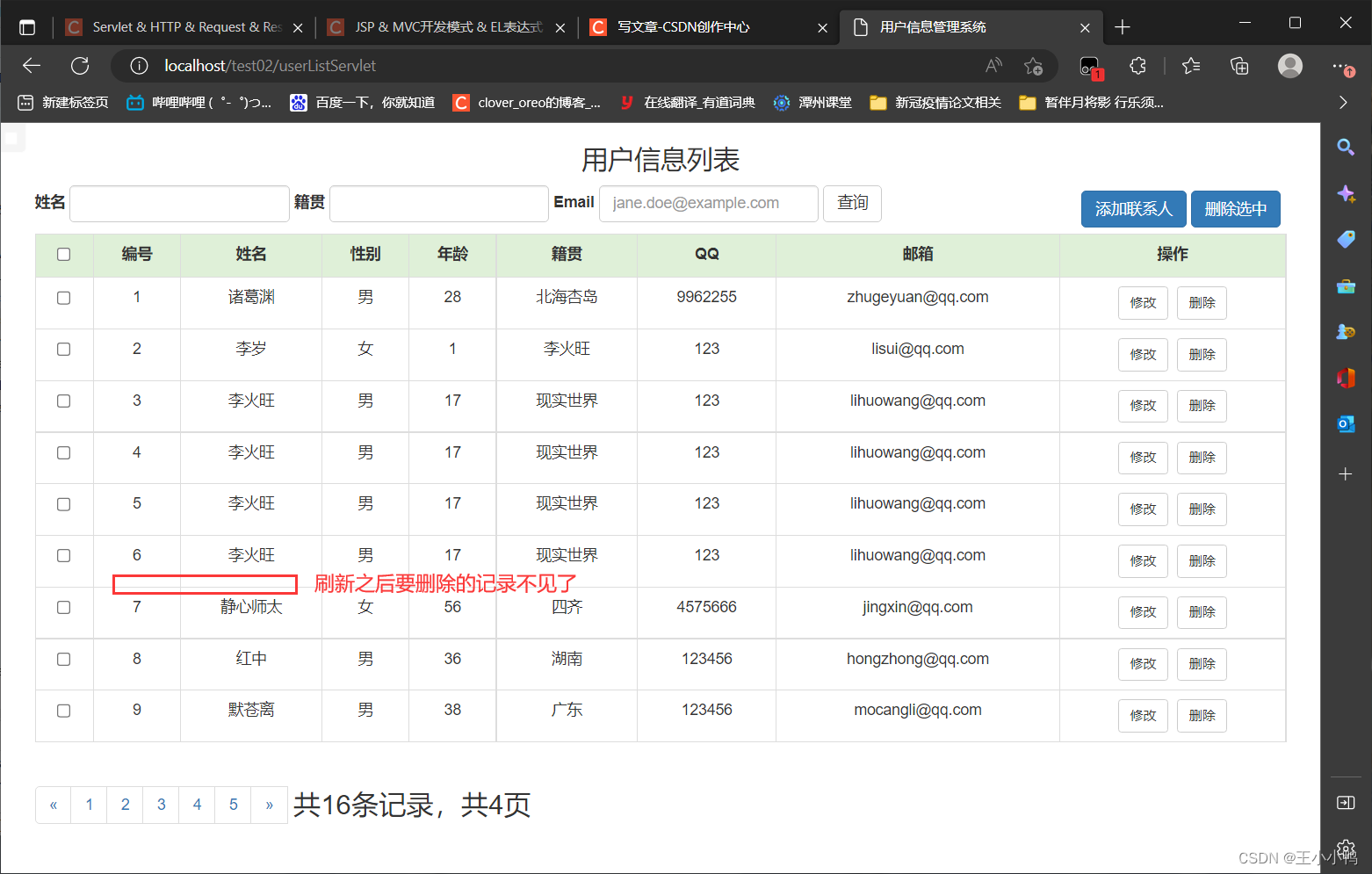//1.设置编码request.setCharacterEncoding("utf-8");//2.获取参数Mapmap = request.getParameterMap();//3.封装对象User user = new User();try {BeanUtils.populate(user,map);} catch (IllegalAccessException e) {e.printStackTrace();} catch (InvocationTargetException e) {e.printStackTrace();}//4.调用service方法报错UserService service = new UserServiceImpl();service.addUser(user);//5.跳转到/userListServlet // 没有共享数据使用重定向 加上虚拟路径request.getContextPath()response.sendRedirect(request.getContextPath()+"/userListServlet"); UserDaoImpl中的addUser方法也优化了@Overridepublic User addUser(User user) {try {//第一版 //String sql = "insert into user2 set name = ?, gender = ?, age = ?, address = ?, qq= ?, email = ?";//第二版String sql ="insert into user2 values(null, ?, ?, ?, ?, ?, ?,null, null )";template.update(sql, user.getName(), user.getGender(), user.getAge(), user.getAddress(), user.getQq(), user.getEmail());} catch (DataAccessException e) {e.printStackTrace();}return user;}添加用户成功!