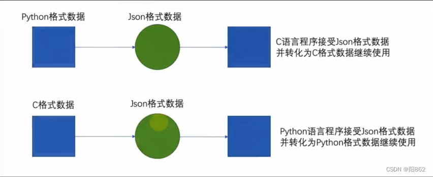 为了让不同的语言都能够相互通用的互相传递数据,JSON就是一种非常良好的中转数据格式。如下图,以Python和C语言互传数据为例:
