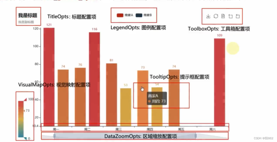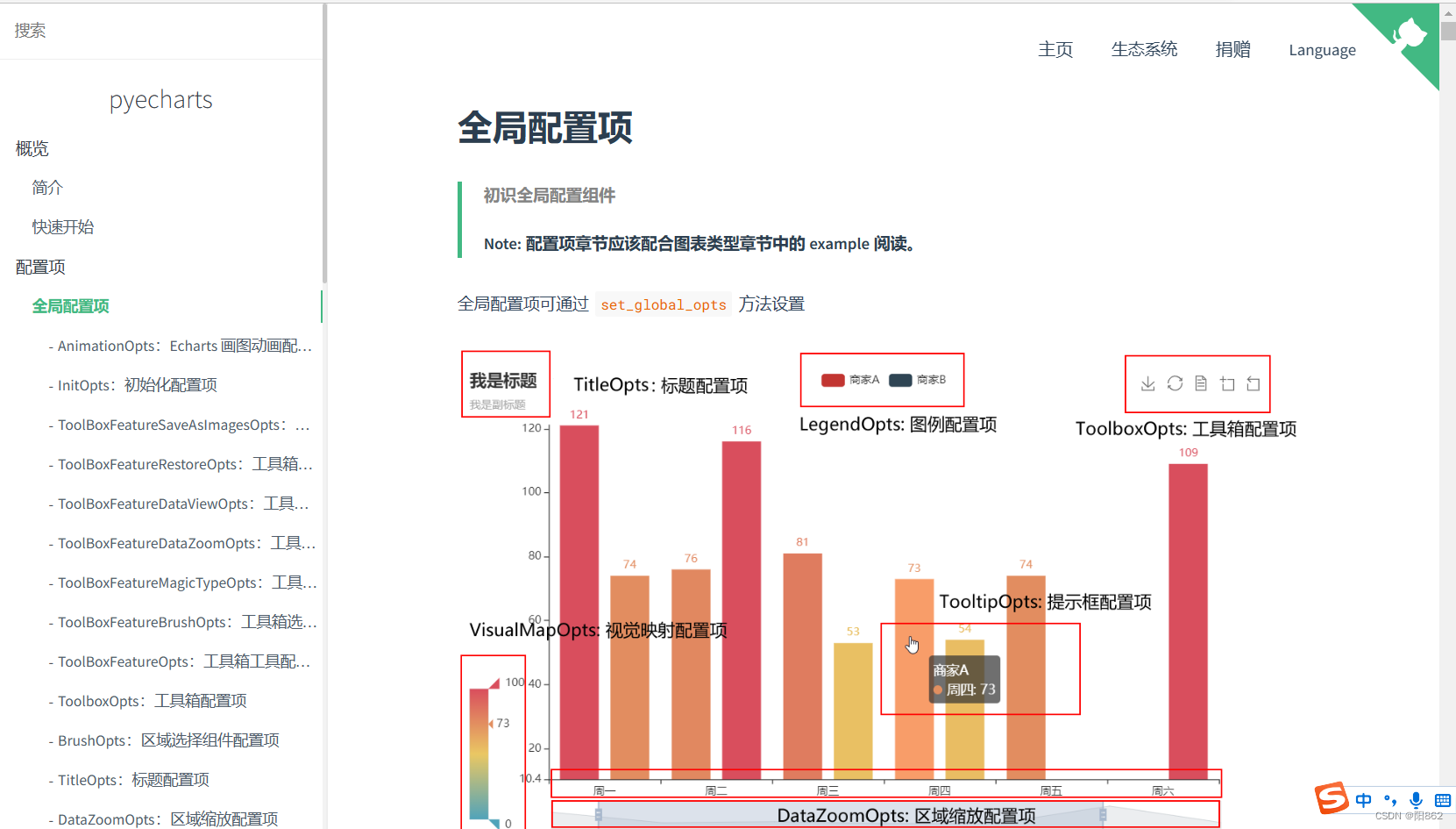 pyecharts模块中有很多的配置选项,常用到2个类别的选项:
