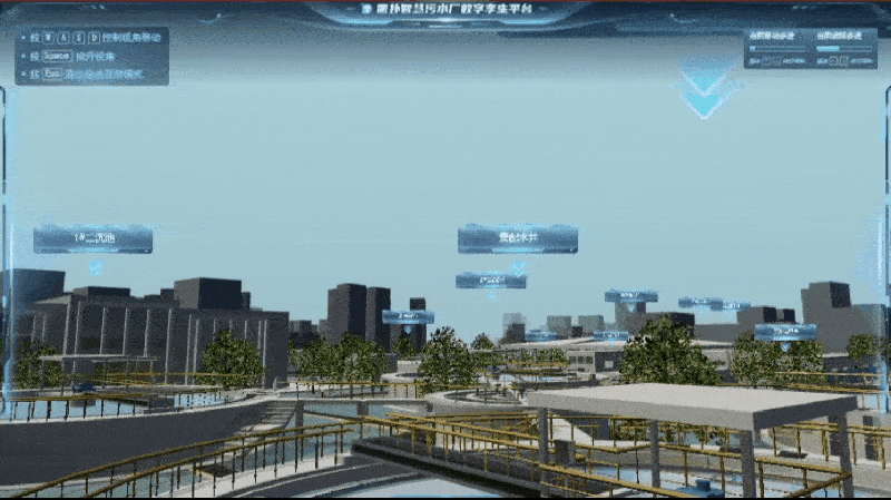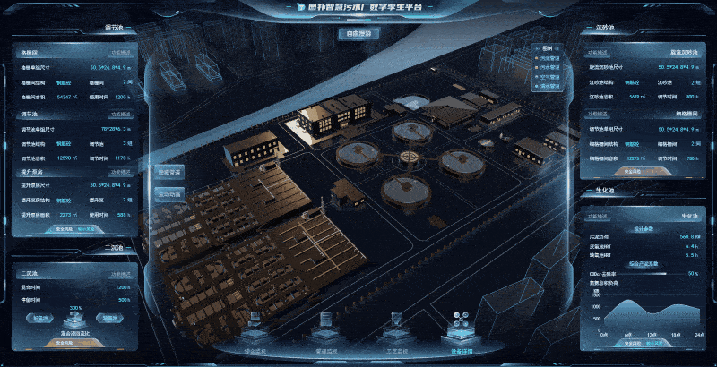 基于 Web 3D 开发技术搭建的净水系统虚拟漫游巡检,将污水厂中的各种设备、零部件、传感器及数据信息进行原比例 3D 建模渲染还原,实时加载净水设备运维数据,模拟现实世界污水厂的设备运行状态。