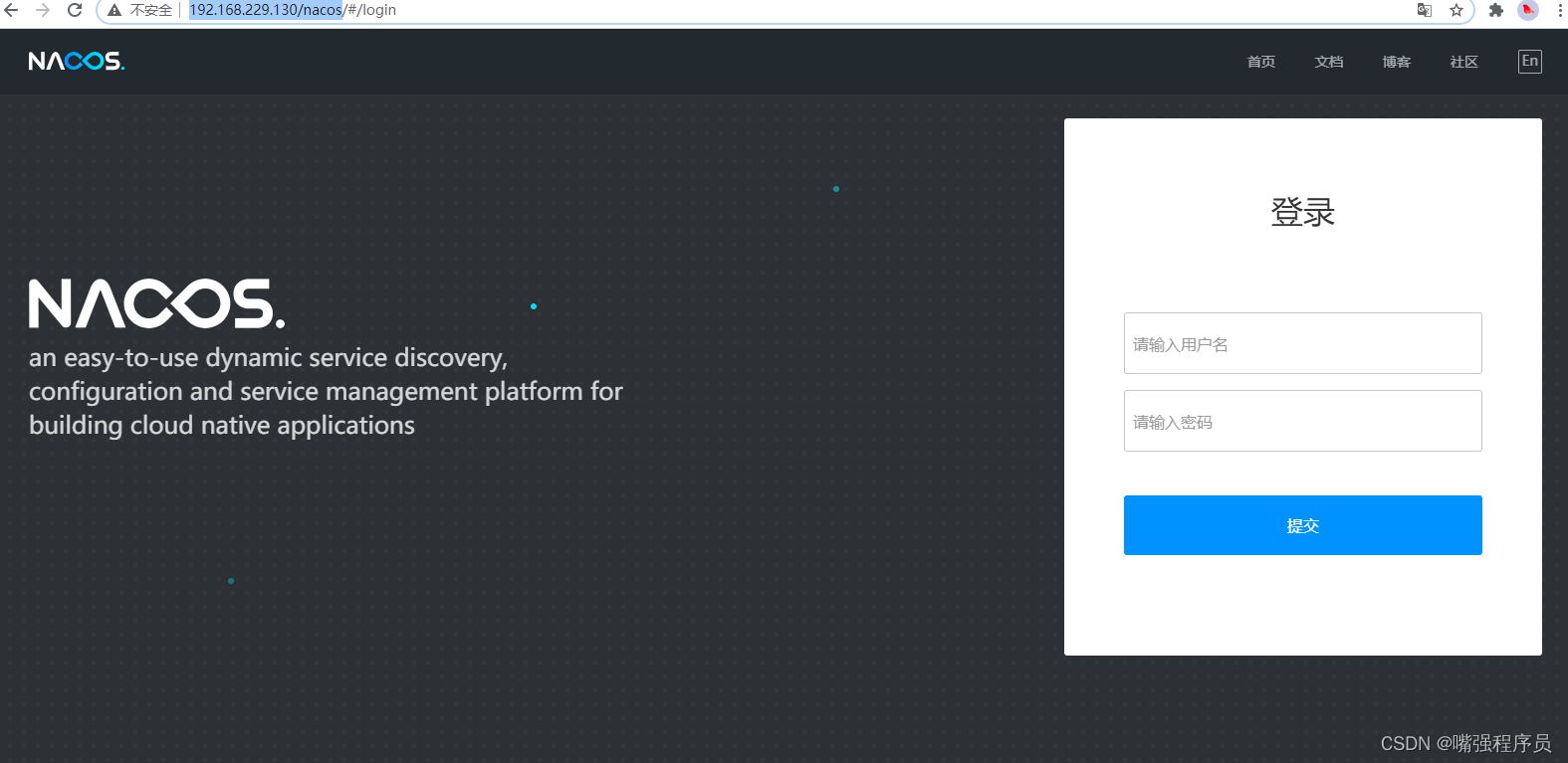 }http {include mime.types;default_type application/octet-stream;sendfile on;keepalive_timeout 65;gzip on;#服务器的集群#upstream tomcats { #服务器集群名字#TODO:172.17.0.3是docker容器的IP #server 172.17.0.3:8080 weight=1;#服务器配置 weight是权重的意思,权重越大,分配的概率越大。#server 172.17.0.4:8080 weight=2;#}#新增1:nacos集群upstream nacoses {server 192.168.0.21:8848 weight=1;server 192.168.0.22:8848 weight=1;} #当前的Nginx的配置server {listen 80;#监听80端口,可以改成其他端口server_name localhost;#当前服务的域名,没有域名可随便填写#新增2:用于重定向至nacos集群location /nacos {proxy_pass http://nacoses;}location / {root /usr/share/nginx/html/dist;#将要访问的网站的目录try_files $uri $uri/ /index.html;#该句代码是为解决history路由不能跳转的问题,在vue-router官网有介绍}#location ^~/api/ {#^~/api/表示匹配前缀是api的请求,proxy_pass的结尾有/, 则会把/api/*后面的路径直接拼接到后面,即移除api#proxy_pass http://tomcats/;#}}}