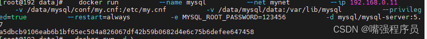 docker run \--name mysql \--net mynet \--ip 192.168.0.11 \-v /data/mysql/conf/my.cnf:/etc/my.cnf \-v /data/mysql/data:/var/lib/mysql \--privileged=true \--restart=always \-e MYSQL_ROOT_PASSWORD=123456 \-d mysql/mysql-server:5.7
