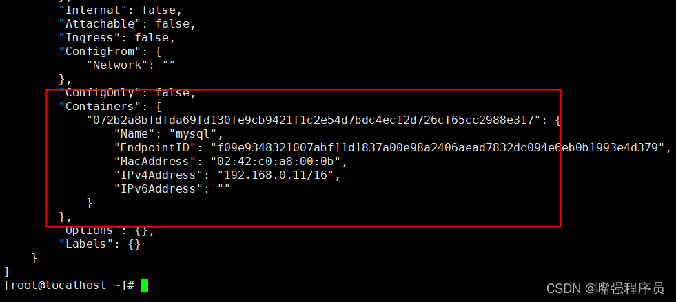docker network connect mynet mysql --ip 192.168.0.11 此时可以查看mynet网络的具体配置: