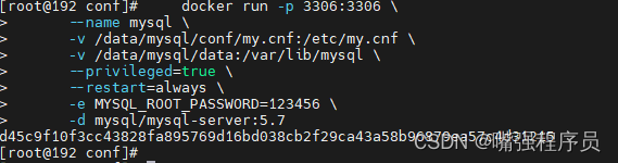 docker run -p 3306:3306 \--name mysql \-v /data/mysql/conf/my.cnf:/etc/my.cnf \-v /data/mysql/data:/var/lib/mysql \--privileged=true \--restart=always \-e MYSQL_ROOT_PASSWORD=123456 \-d mysql/mysql-server:5.7