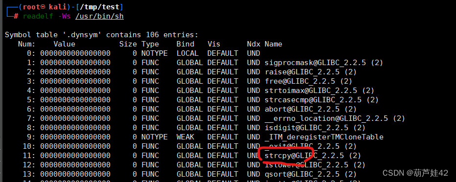 readelf 命令查看一下 系统命令/bin/sh调用的函数,发现了 strcpy()