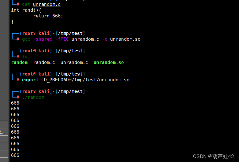 神奇的事情发现了,输出了我们自己的rand()函数。成功劫持了random程序中的rand()函数,将rand函数替换为我们自己所编写的版本