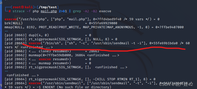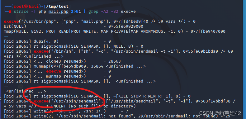 strace -f php mail.php 2>&1 | grep -A2 -B2 execve