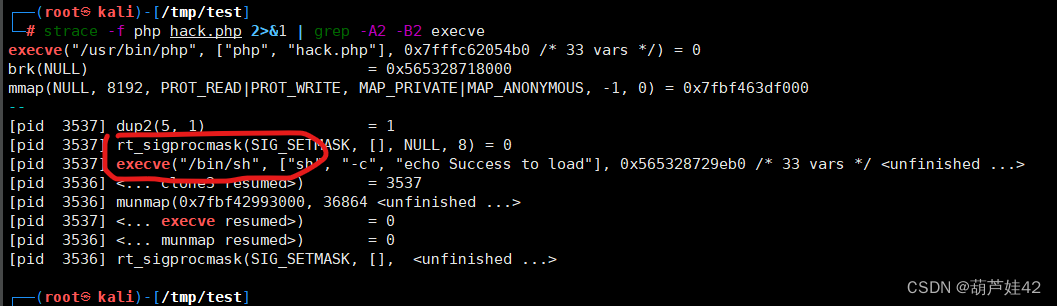 strace -f php hack.php 2>&1 | grep -A2 -B2 execve