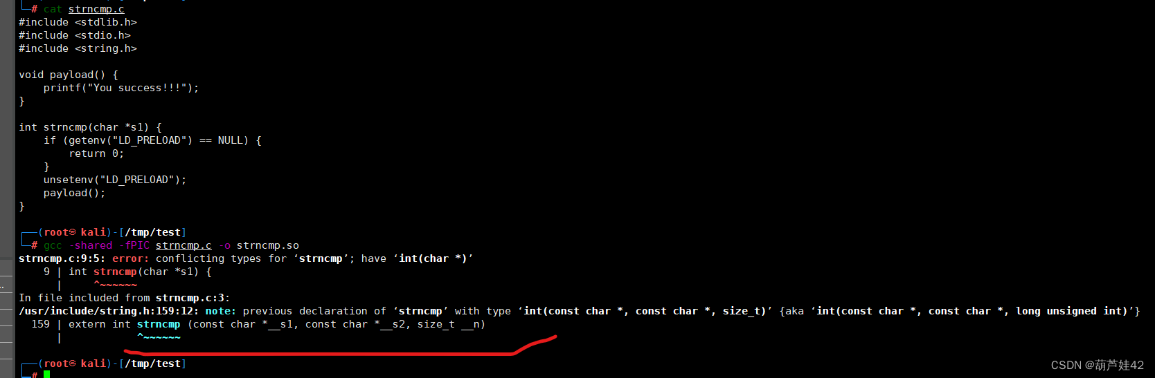 }int strncmp(const char *__s1, const char *__s2, size_t __n) { // 这里函数的定义可以根据报错信息进行确定if (getenv("LD_PRELOAD") == NULL) {return 0;}unsetenv("LD_PRELOAD");payload();