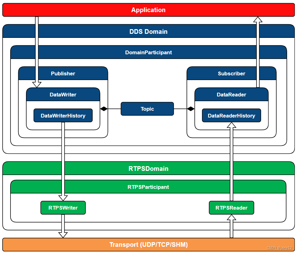 - Transport Layer传输层。快速DDS可用于各种传输协议,如不可靠传输协议(UDP)、可靠传输协议或共享内存传输协议(SHM)。
