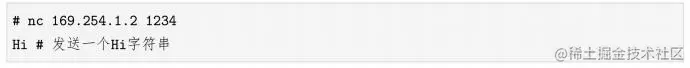 意思是向新建network namespace的169.254.1.2:1234发送一个网络报文Hi。切回原先的终端,会发现顺利地收到了一个Hi字符串。