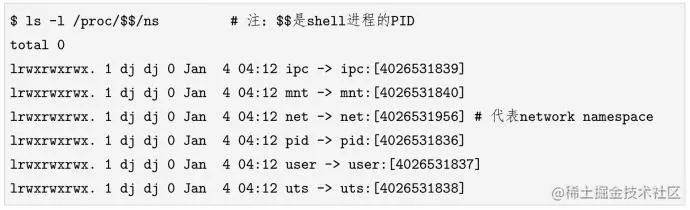 我们看到的符号链接的其中一个用途是确定某两个进程是否属于同一个namespace。如果两个进程在同一个namespace中,那么这两个进程/proc/PID/ns目录下对应符号链接文件的inode数字(即上文例子中[]内的数字,例如4026531839,也可以通过stat ()系统调用获取返回结构体的st_ino字段)会是一样的。