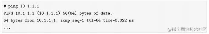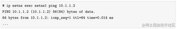 上面两条命令首先进入netns1这个network namespace,为veth1绑定IP地址10.1.1.1/24,并把网卡的状态设置成UP,而仍在主机根network namespace中的网卡veth0被我们绑定了IP地址10.1.1.2/24。这样一来,我们就可以ping通veth pair的任意一头了。例如,在主机上ping 10.1.1.1(netns1 network namespace里的网卡),如下所示: